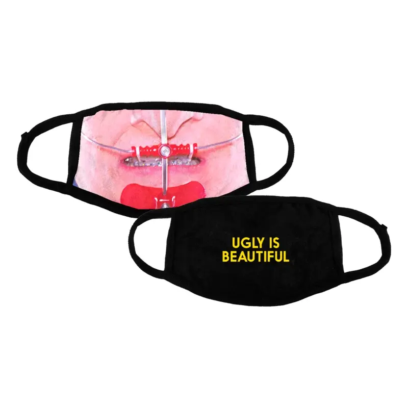 The 1993 facemask from Oliver Tree features the text “Ugly is Beautiful” on the front printed in yellow, and a photo of Oliver’s face printed on the back of a black cotton facemask