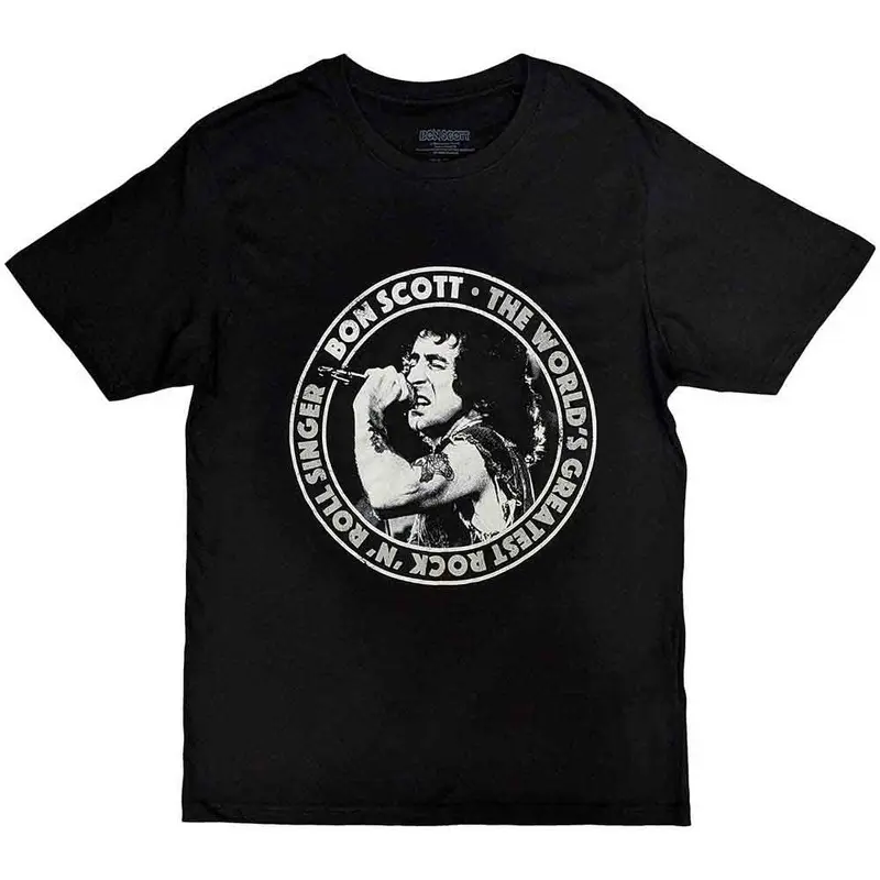 AC/DC Bon Scott The World's Greatest Singer Black T-ShirtSmall An official licensed Bon Scott T-Shirt featuring the TWGRRS Circle design motif.Material:Soft-Style Cotton.