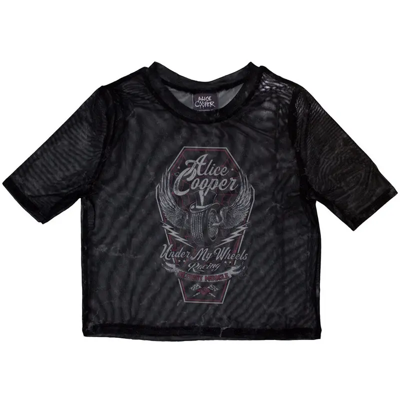 Alice Cooper Under My Wheels Mesh Cropped Back Ladies T-ShirtXX-Small An official licensed Alice Cooper Crop Top featuring the Under My Wheels design motif.Material:96% Polyester & 4% Elastane.