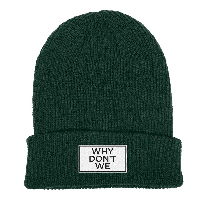 The Why Don't We Beanie herefeatures a woven label of the band's name. The label is sewn on a hunter green flip beanie.