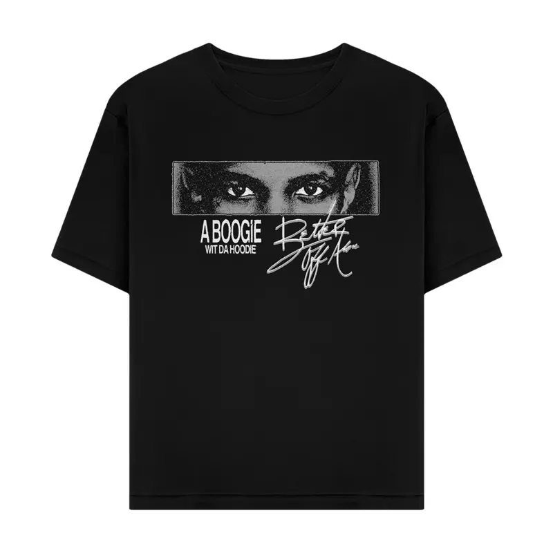 The Better Off Alone T-shirtfeatures a cropped image of A Boogie above his name and album title printed on the front of a black unisex t-shirt.