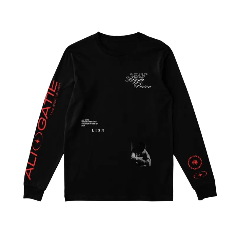 Printed front, back, and sleeves on a 100% cotton black long sleeve t-shirt. This product is a preorder and won't be in stock for a few months