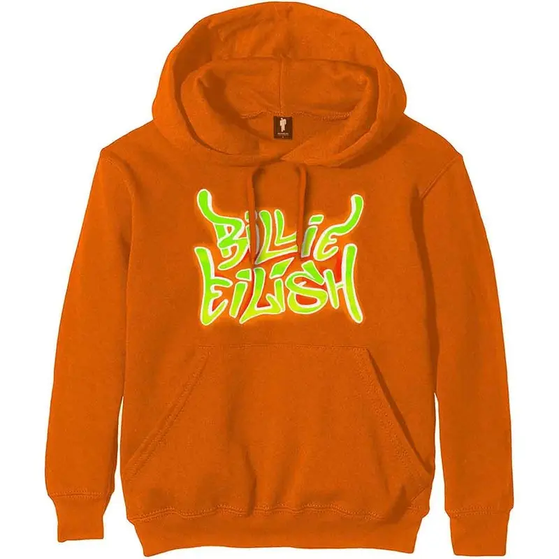 An official licensed Billie Eilish Unisex Pullover Hoodie featuring the ‘Airbrush Flames Blohsh’ design motif. This high quality Pullover Hoodie is available in a orange colourway.