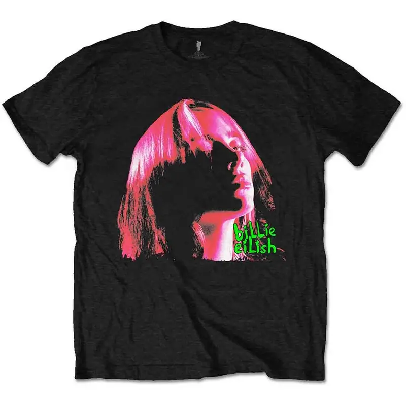 Billie Eilish Pink Neon Shadow Black T-ShirtLarge An official licensed Billie Eilish T-Shirt featuring the Neon Shadow Pink design motif.Material:Soft-Style Cotton.