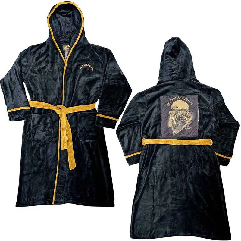 Black Sabbath Large/X-Large BathrobeAn official licensed Bathrobe featuring the Black Sabbath 'Us Tour 78 Avengers' design motif. This high quality Bathrobe is available in a black colourway.Black super soft fleece hooded robe with contrasting gold piping