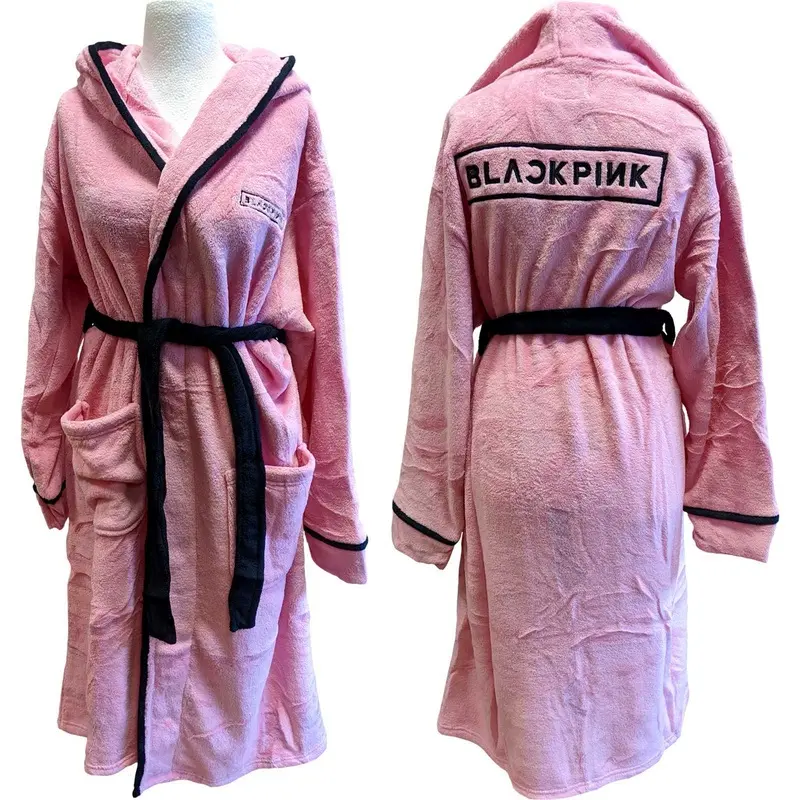 Blackpink Large/X-Large BathrobeAn official licensed Unisex Bathrobe featuring the 'Logo' design motif. This high quality Bathrobe is available in a pink colourway.Pink super soft fleece hooded robe in toweling with black piping & belt. With logo on breast