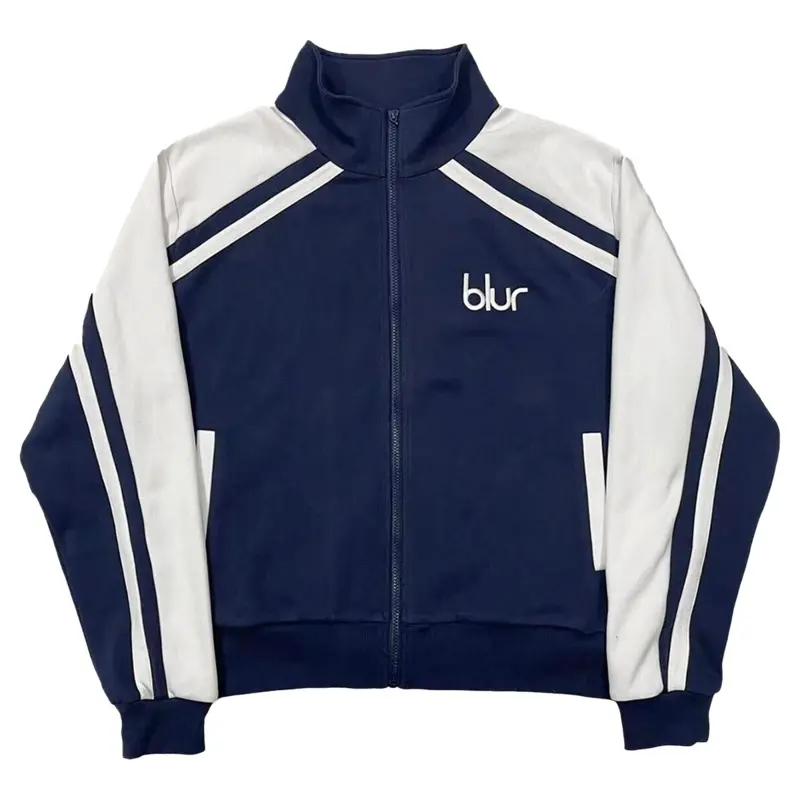 Blur Track JacketCustom navy track jacket with white sleeves featuring blur logo screen print on back and left pocket. Limited stock available.All Last Chance items are final sale, and returns will not be accepted for change of mind