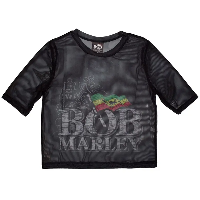 Bob Marley Logo Mesh Cropped Black Ladies T-Shirt X-Large An official licensed Bob Marley Crop Top featuring the Logo design motif. Introducing our stunning collection of mesh fabric fitted tops, designed to elevate your customer's style and guaranteed to