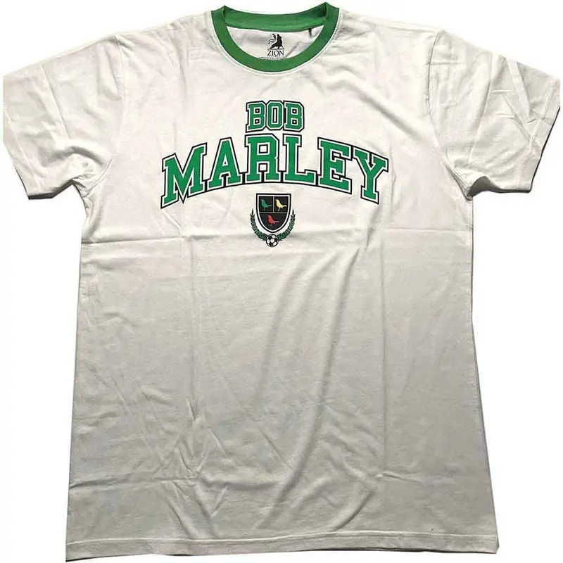 Bob Marley Ringer Collegiate Crest White T-ShirtXX-Large An official licensed Bob Marley Ringer T-Shirt featuring the Collegiate Crest design motif.Material:60% Recycled Cotton And 40% Recycled Polyester.