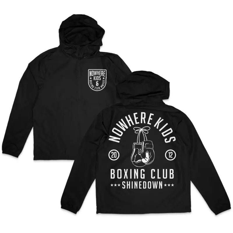 The black Shinedown Boxing Club Windbreaker for the ten year anniversary of their fourth studio album, Amaryllis. The windbreaker includes a Nowhere Kids Boxing Club logo on the front right chest pocket and a larger 2012 Nowhere Kids Boxing Club logo on the back.