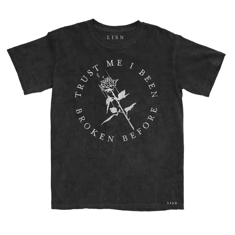 Front graphic screeprinted on a mineral wash black t-shirt.