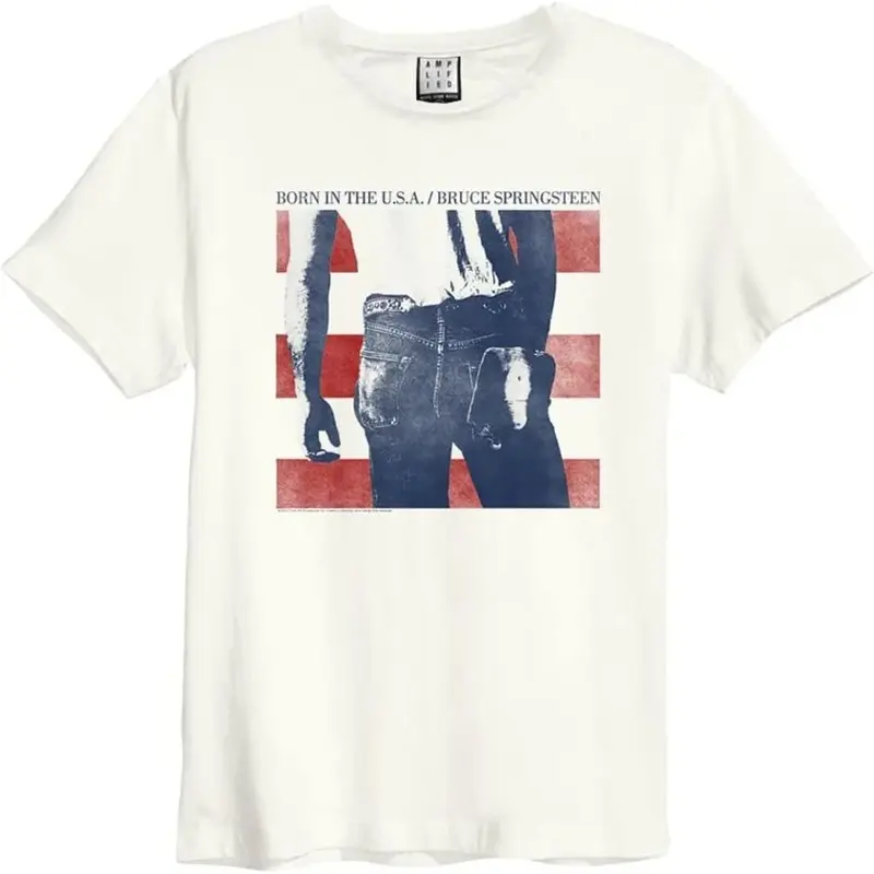 Bruce Springsteen Born In The USA Vintage White T-ShirtMediumAn official licensed Bruce Springsteen T-Shirt. Vintage feel with rolled back cut seems to hem & sleeveMaterial:Super Soft 100% Carbon Brushed Cotton.