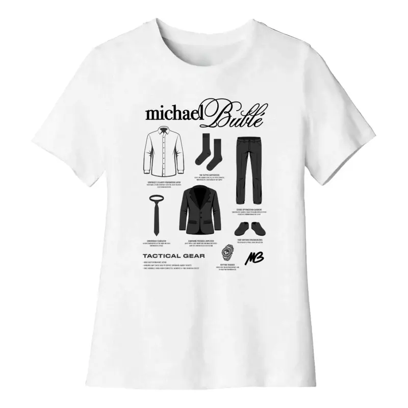 Relaxed Jersey White Tee printed with Michael’s tactical wardrobe gear.