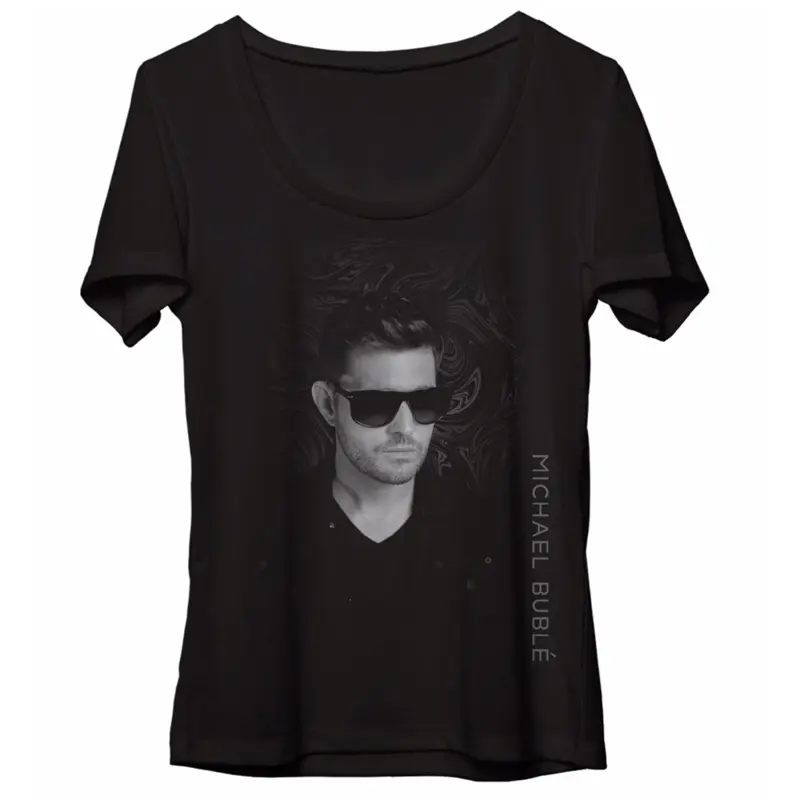 Soft slouchy womens fitted shirt with a neckline that can be pulled off the shoulder. Features the Buble Shades design.