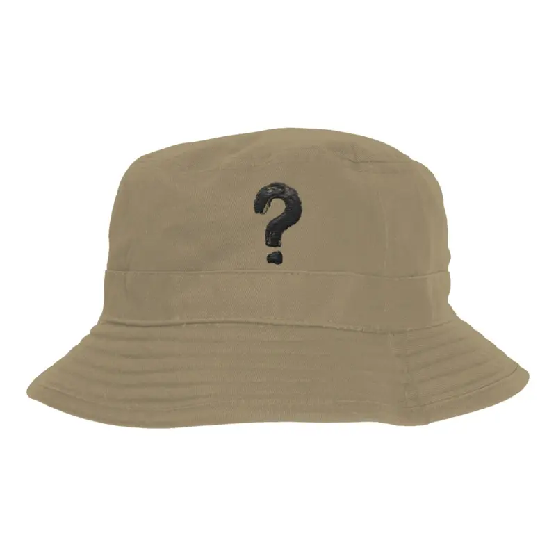 The Why Don’t We ‘Bucket Hat (khaki)’ features a black ‘?’ embroidered on the front of a khaki bucket hat. *Item is expected to ship to you on or before October 30th. We will ship the product sooner if possible.