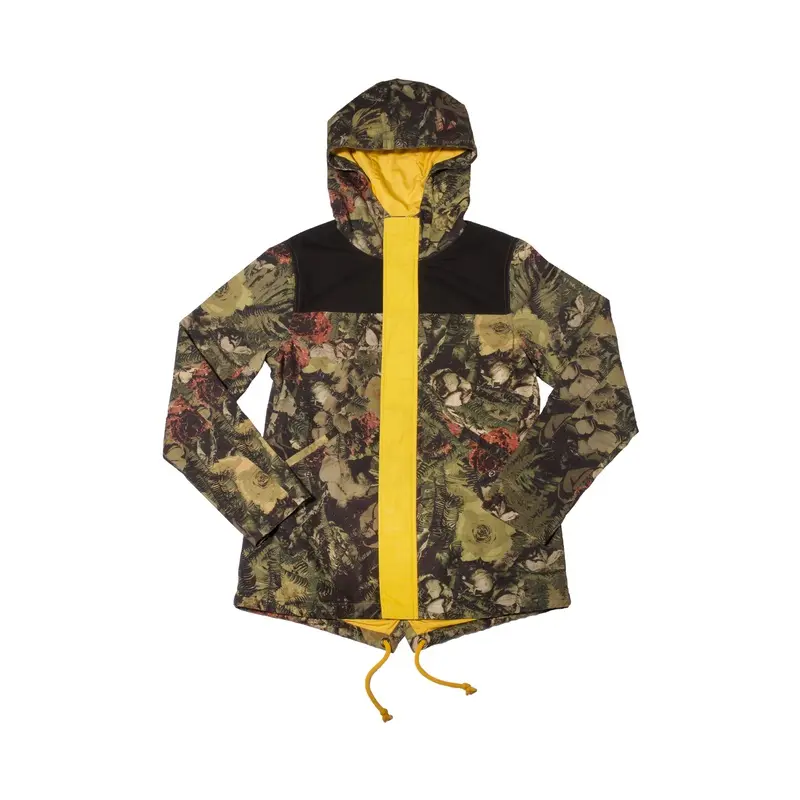 The Twenty One Pilots ‘Parka’ here features two pockets on the front of the camouflage parka and ‘TWENTY ONE PILOTS’ in yellow text on the right sleeve. This design is on a unisex camouflage parka.