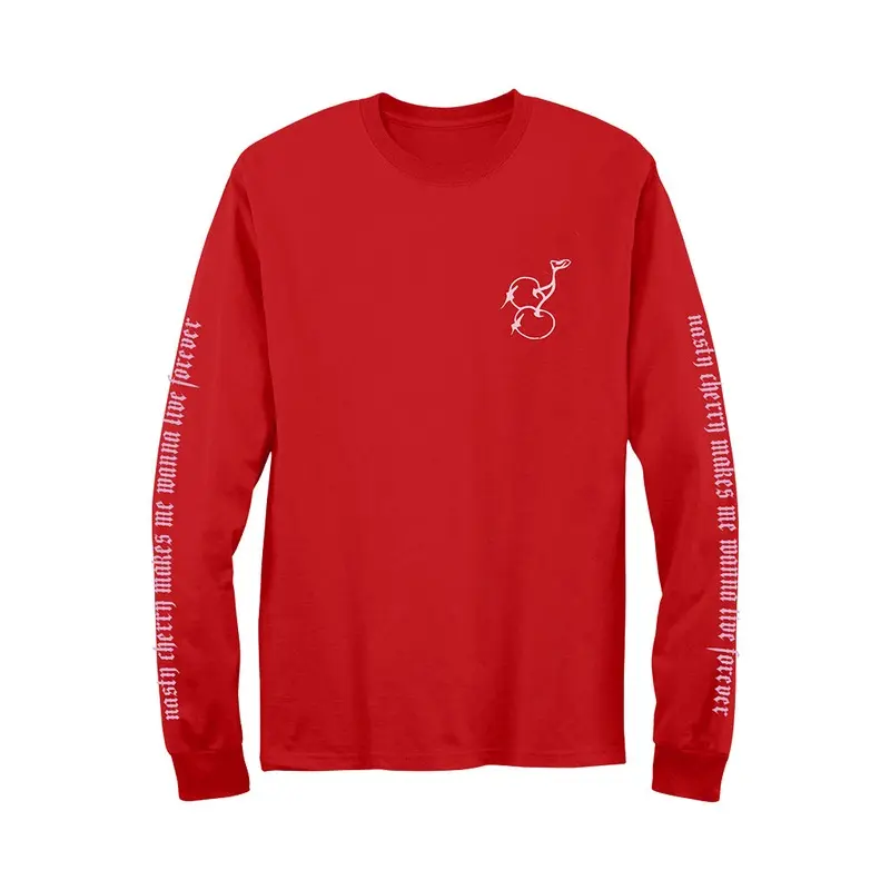 Nasty Cherry makes me wanna live forever over the pocket cherries on a red Gildan longsleeve.
