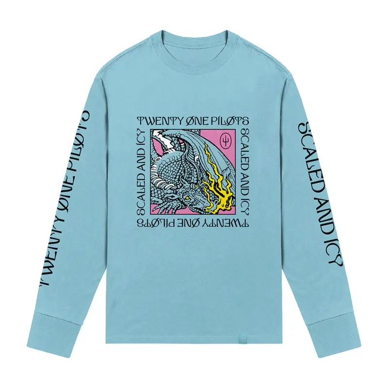 The Twenty One Pilots ‘Dragon Box Blue Long Sleeve T-Shirt’ features a Scaled And Icy dragon box design on the front of the shirt and ‘Twenty One Pilots’ ‘Scaled And Icy’ written in black down the sleeves. This design is printed on a blue unisex long sleeve t-shirt.