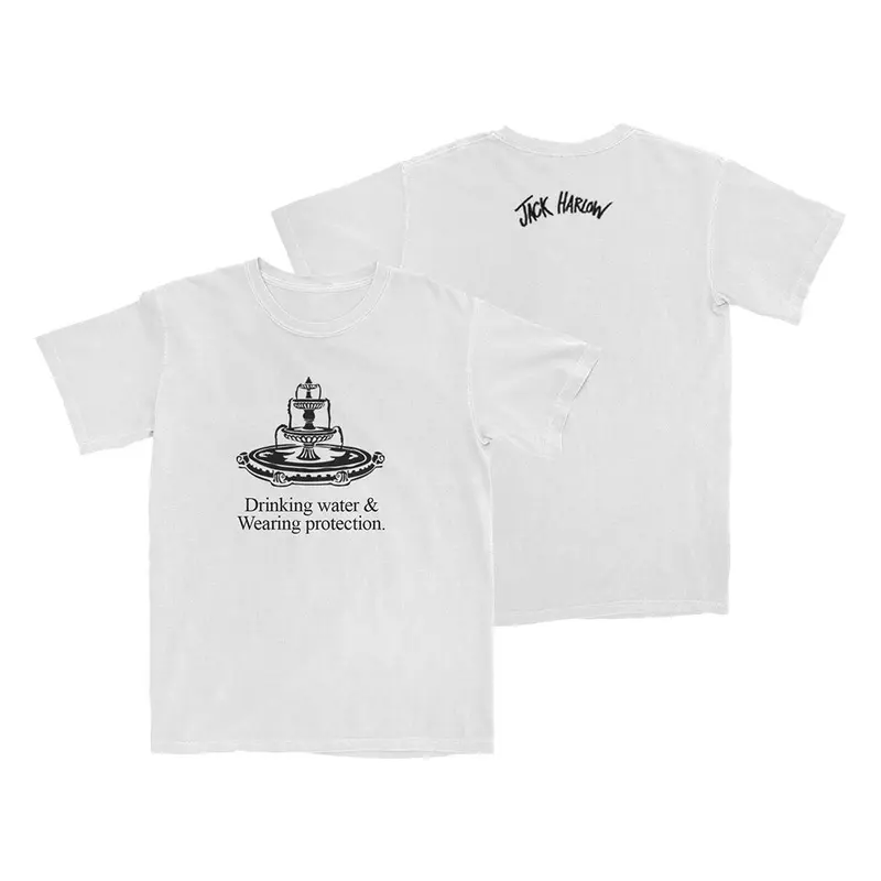 The Jack Harlow ‘Drinking Water T-Shirt’ features an image of a water fountain and ‘Drink water & Wearing protection.’ written underneath on the front of the shirt. The back features the Jack Harlow logo. This design is printed on a white unisex t-shirt.