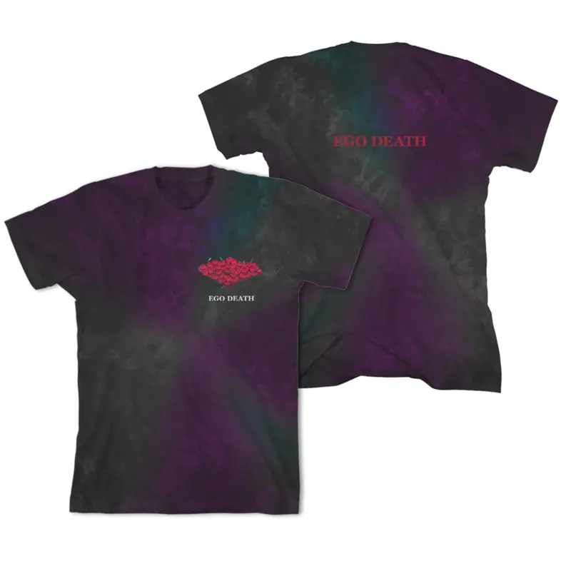 The Ego Death Acid Wash T-shirt from Ty Dolla $ign features a bed of roses inspired by the single artwork on the front in the pocket area, and the song title on the back printed in red on the back of a multi-color acid wash t-shirt.