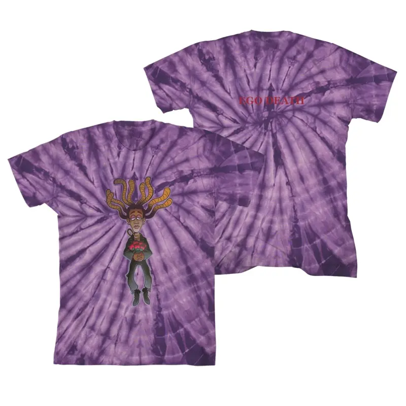 The Ego Death Purple Ty Dye T-shirt from Ty Dolla $ign features an illustration of Ty from the single artwork on the front and the song title on the back printed in red on the back of a purple tie-dyed t-shirt.