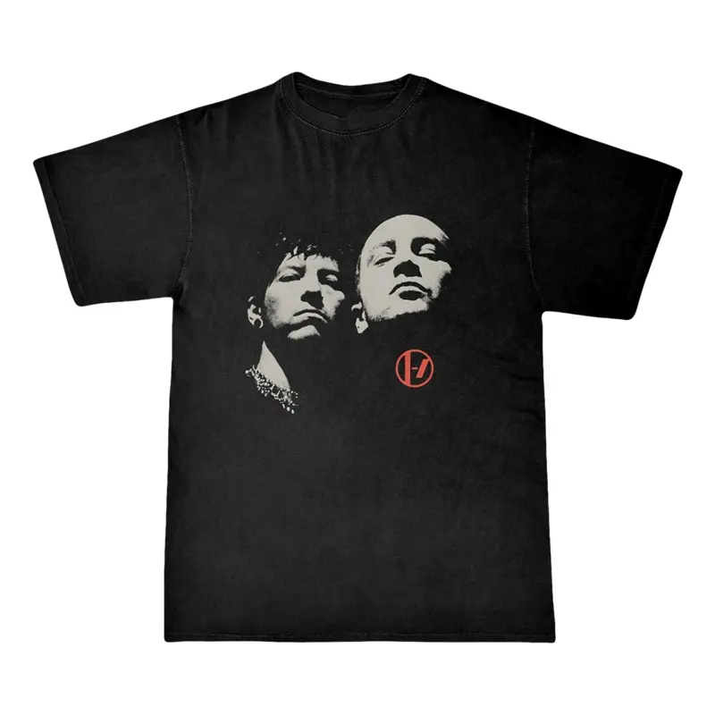 The Twenty One Pilots Faces Tee features a black and white graphic of Tyler and Josh on the front. This design is printed on a black unisex t-shirt 100% ring spun cotton.