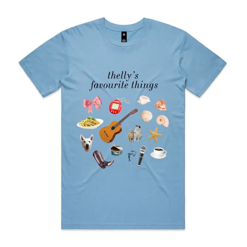 Thelma’s Favorite things printed on a Blue T-Shirt