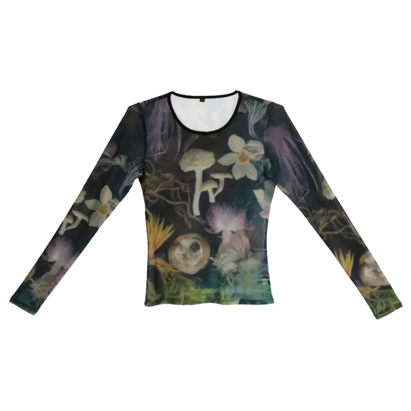‘Floral Mesh Top’ all over print design on a mesh see-through top. The mesh top photographed is a size M.