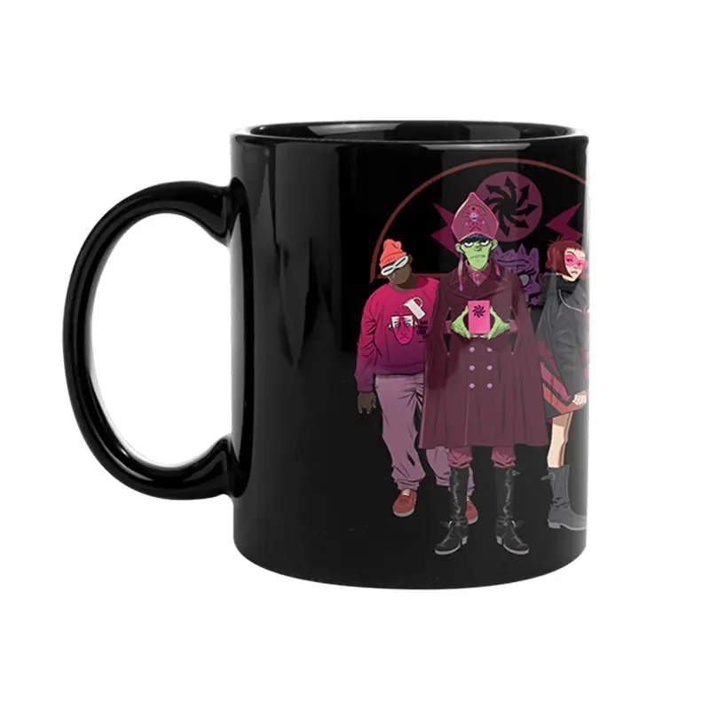 Gorillaz Black ceramic mug with printed Gorillaz illustration.