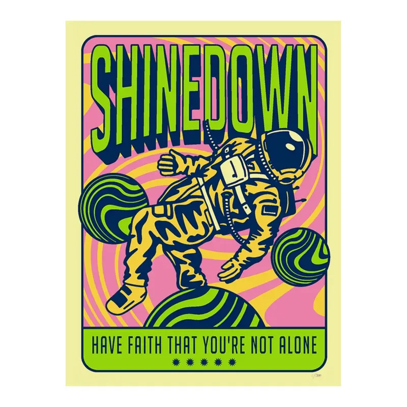 The 18″x24″ Have Faith Screened Printed Poster features Shinedown in block letters above an illustration of an astronaut and lyrics from their single Daylight. This is a 5 color screenprinted poster which is hand numbered and limited to 300 units worldwide.