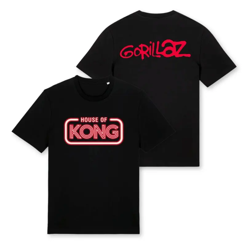To celebrate the launch of Gorillaz House of Kong Exhibition, select products are available to pre-order now.Items ship on 29th August, as we get ready to close the gates of Kong. Secure yours early.House of Kong organic cotton logo t-shirt with front & ba