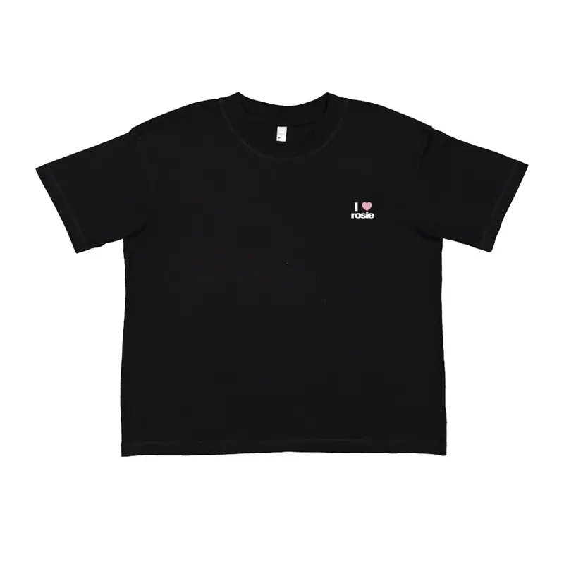 i rosie screenprinted on a relaxed unisex black t-shirt. 100% CottonSMLXL2XWidth21 22 23 24 25 Length 2425262728