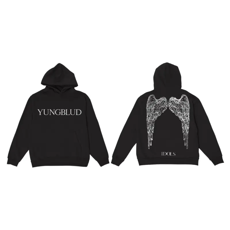 BLACK HEAVYWEIGHT UNISEX HOODIE FEATURINGIDOLSSCREEN PRINTED GRAPHICS.