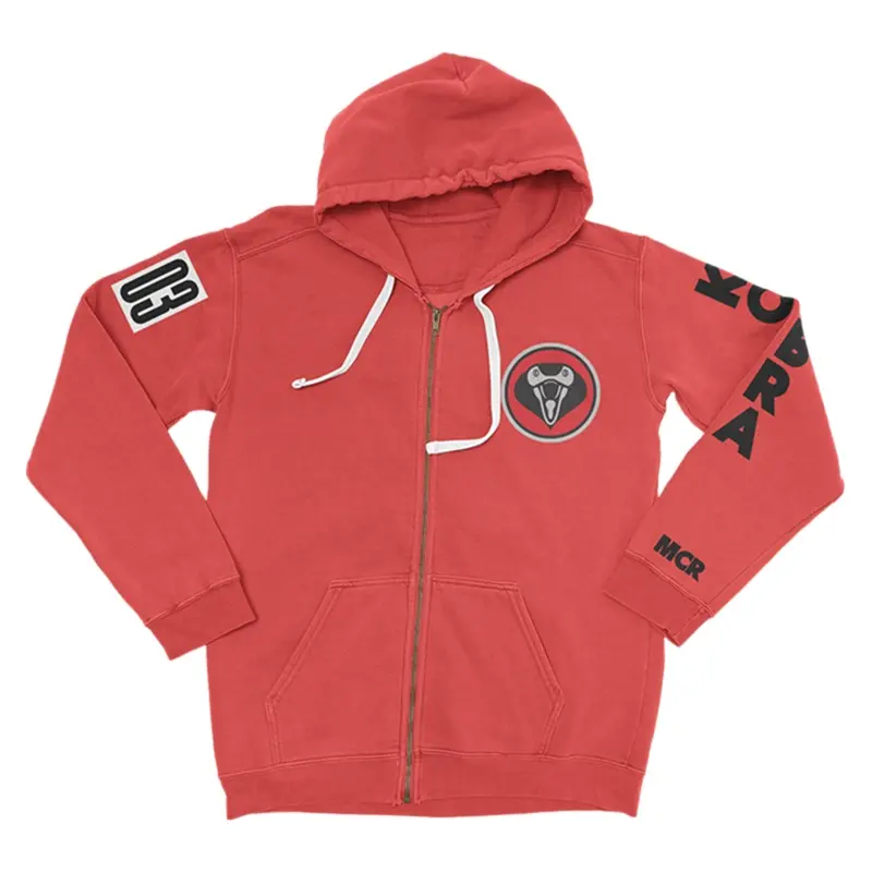 Killjoys make some noise!Kobra Kids iconic jacket recreated on red zip hoodie.