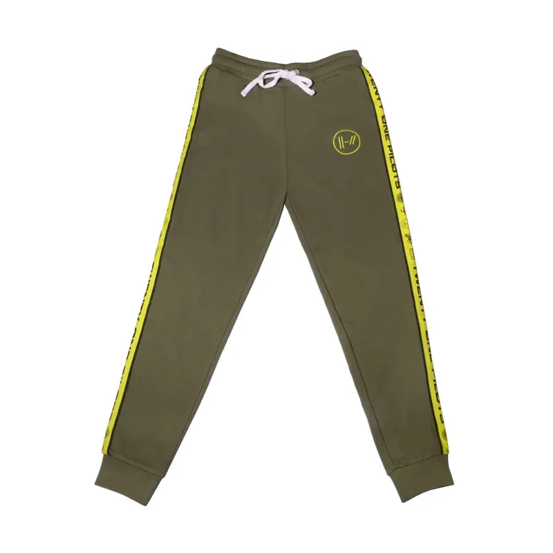 THE TWENTY ONE PILOTS ‘LOGO STRIPED JOGGERS’ HERE FEATURE THE BAND LOGO EMBROIRDERED IN YELLOW ON THE FRONT OF THE LEFT LEG. ‘TWENTY ONE PILOTS’ IN BLACK FONT READS DOWN BOTH PANT LEGS ON A YELLOW STRIPE. THIS DESIGN IS ON A UNISEX 60% COTTON/40% POLYESTER MID WEIGHT FLEECE PANT.