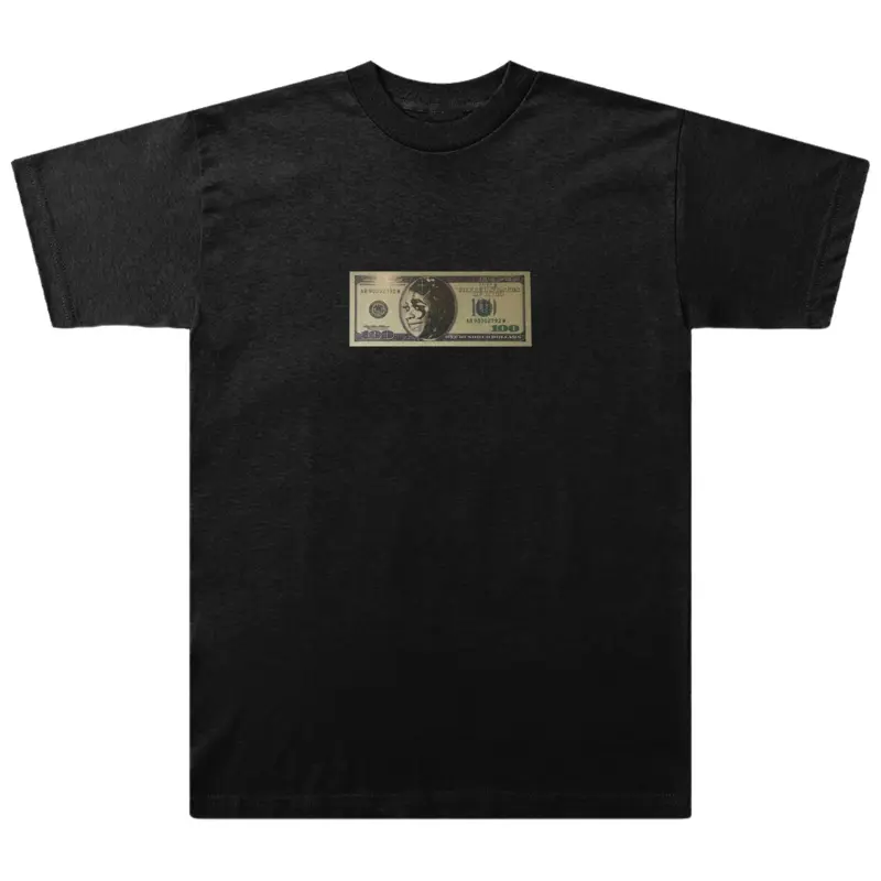 The Rico Nasty MONEY T-Shirt’ features a $100 bill Rico Nasty graphic printed on the front of a black unisex t-shirt.