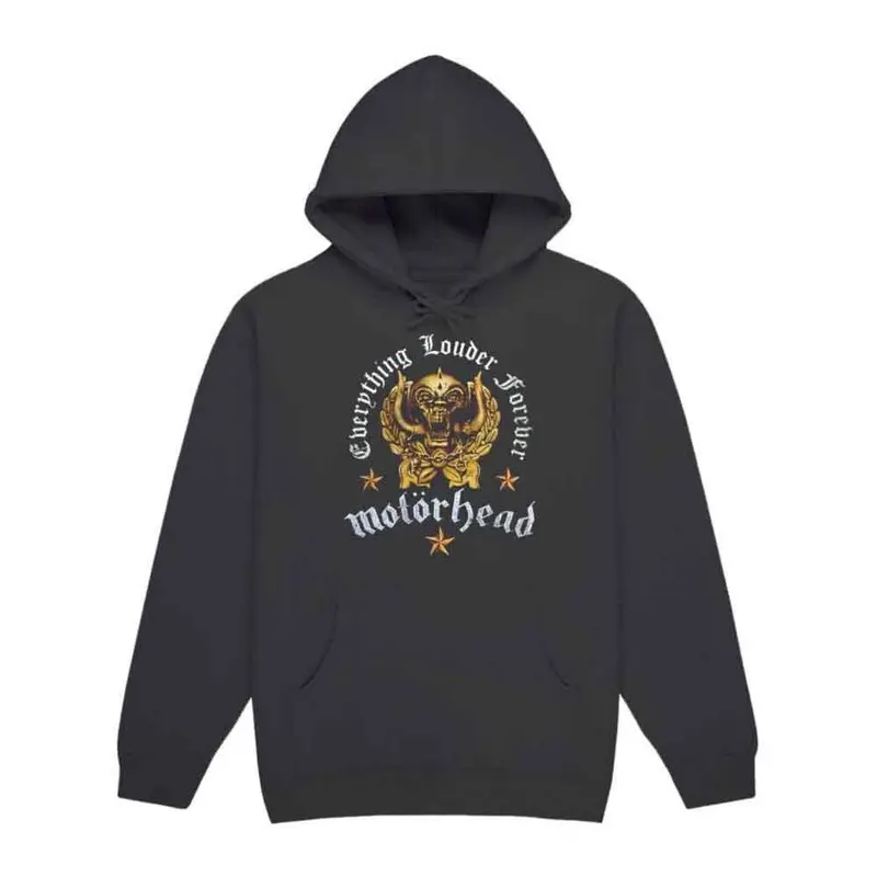 Motorhead Everything Louder Forever Charcoal Grey HoodieLarge An official licensed Motorhead Unisex Pullover Hoodie featuring the 'Everything Louder Forever' design motif. This high quality Pullover Hoodie is available in a charcoal grey colourway.High qua