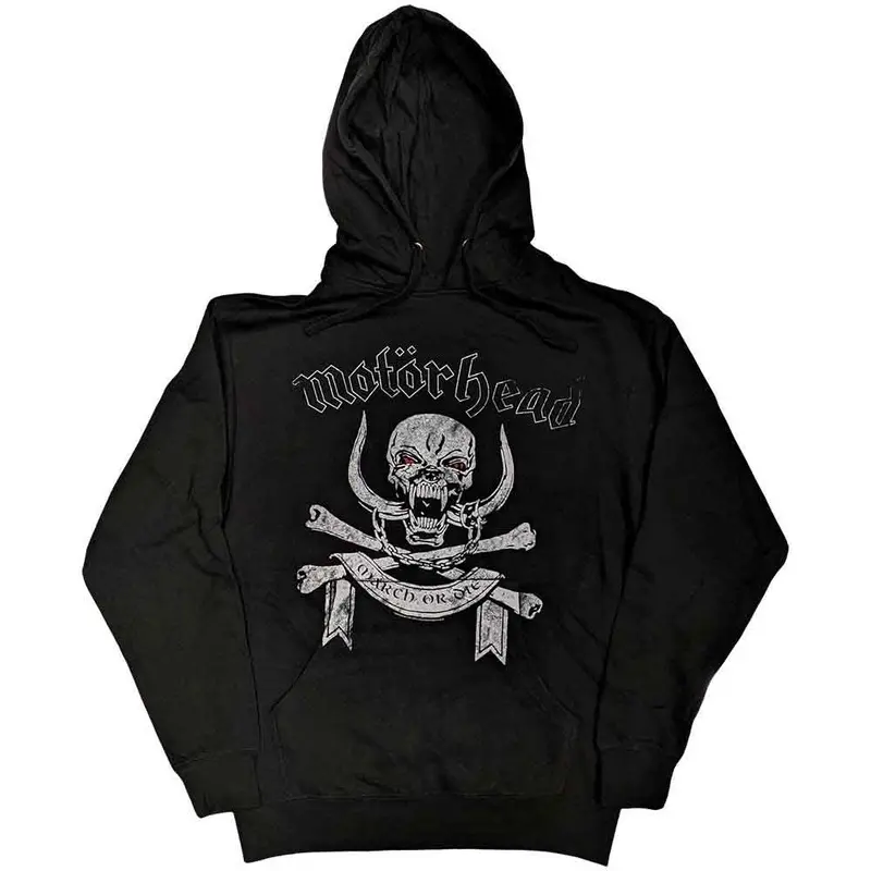 Motorhead March or Die HoodieLarge An official licensed Motorhead Unisex Pullover Hoodie featuring the 'March or Die' design motif. This high quality Pullover Hoodie is available in a black colourway.High quality cotton unisex pullover hoodie featuring dra