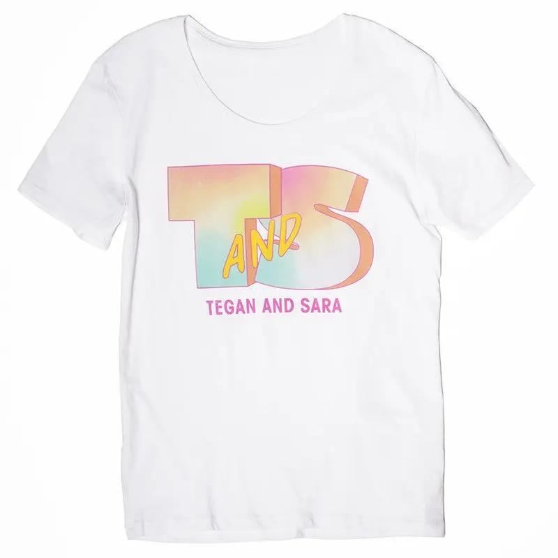 This "T and S" multi-colored, gradient design is inspired by a vintage MTV logo.Printed on a unisex, white, wide neck, 100% ring spun cotton t-shirt.