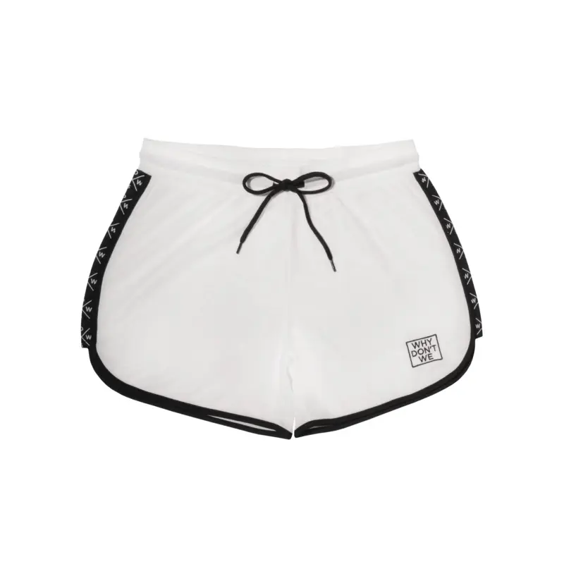The Why Don't We Panel Shorts (White) here are a custom made 100% Polyester short. The band logo is embroidered at the bottom of the left leg. The sides of the shorts have a custom WDW5 Cross logo sewn into them.