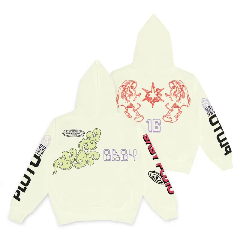 The ‘Baby Pluto Hoodie’ features designs inspired by the album. This off white hoodie is an 80% cotton 20% polyester blend.