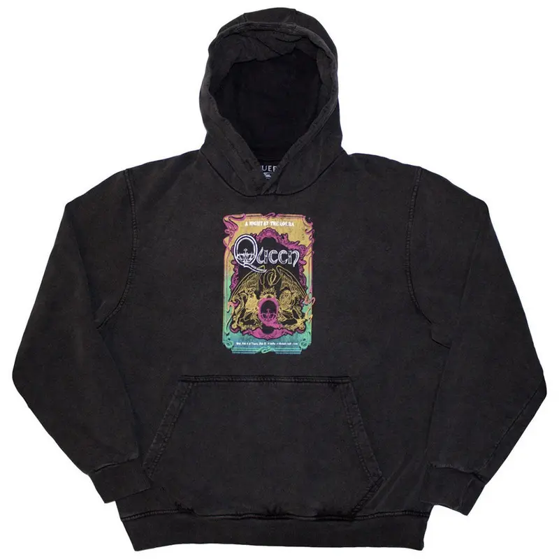 An official licensed Queen Unisex Pullover Hoodie featuring the ‘Night At The Opera’ design motif. This superior quality pullover hoodie is available in a charcoal grey stone wash colourway.