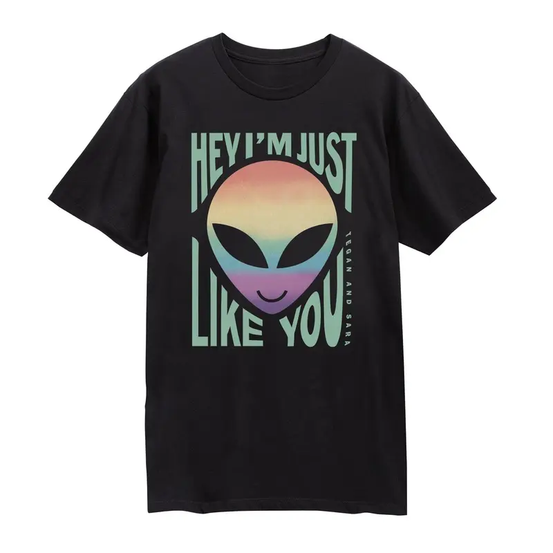 Even if youre from another planet, Im just like you. The Rainbow Alien tee is printed on a heavyweight 5.7oz, 100% cotton, relaxed fit black t-shirt with a drop shoulder and double stitched neck.