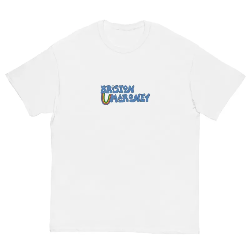 Features Briston Maroneys rainbow logo on the front of a cotton, unisex tee. Available in azaela blue, sand tan, and white.