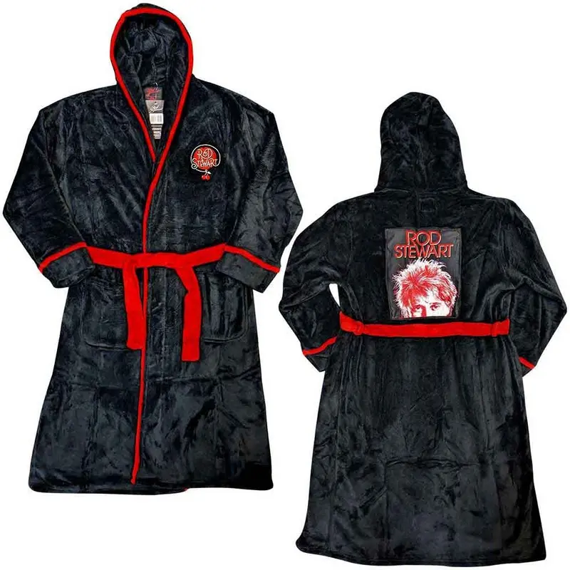 Rod Stewart Large/X-Large BathrobeAn official licensed Rod Stewart Unisex Bathrobe featuring the 'Cherries Logo' design motif. This high quality Bathrobe is available in a black & red colourway.Black hooded robe in towelling with red piping & belt with log
