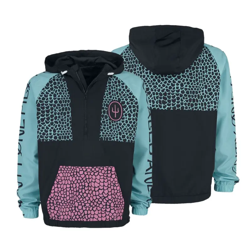 The Twenty One Pilots SAI Windbreaker features a scaled print on the front and back of the windbreaker. The sleeves feature Twenty One Pilots and Scaled and Icy logos. This design is printed on a unisex windbreaker with a quarter zip on the front, side zip on the left side and a kangaroo pocket.