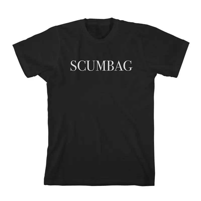 This Goody Grace 'Scumbag T-shirt' here has 'SCUMBAG' in white text on the front of the t-shirt. This design is on a unisex black t-shirt.