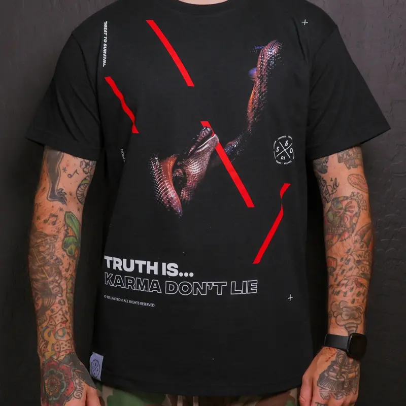 The Shinedown ‘Snake T-Shirt’ features a Shinedown SD circle logo and image of a snake with ‘Truth Is Karma Don’t Lie’ written below it on the front of the shirt. The back features ‘TRUTH’ in red. This design is printed on a black unisex t-shirt.