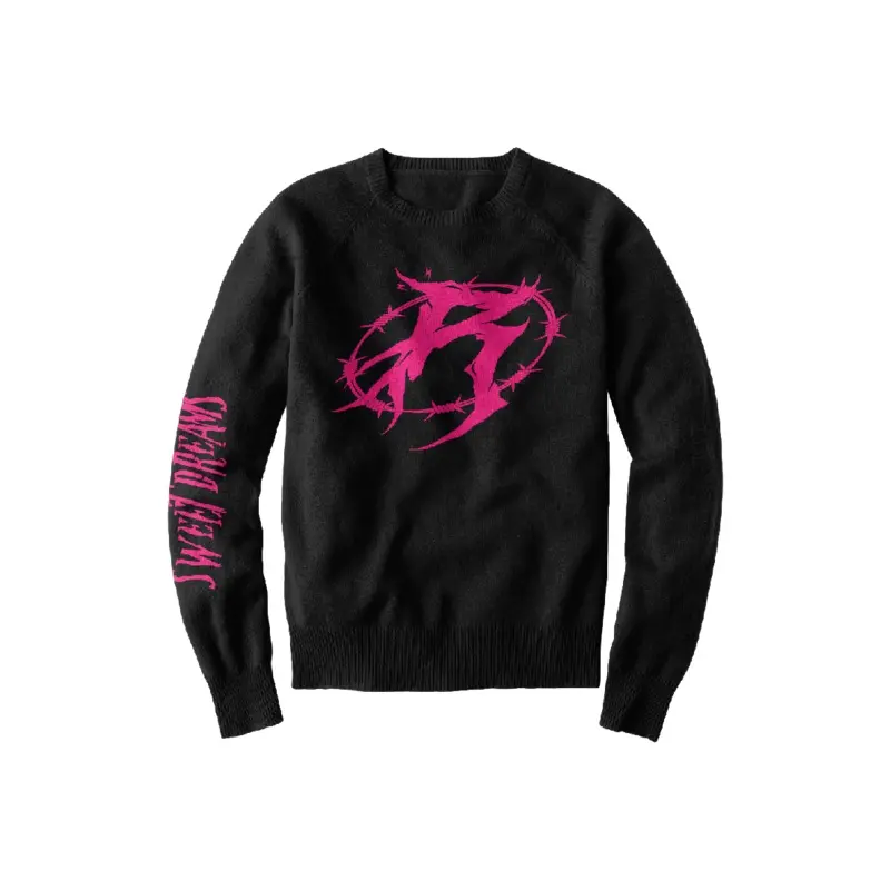THE RICO NASTY 'SWEET DREAMS KNIT SWEATER' FEATURES RICO'S LOGO ON THE FRONT AND THE TEXT SWEET DREAMS ON THE ARM. THESE DESIGNS ARE IN PINK ON A CUSTOM BLACK SWEATER.Sweet Dreams Knit Sweater.