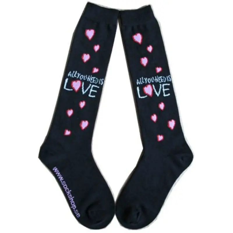 Official licensed ladies 80% Cotton - 18% Polyester - 2% Elastane Knee High Socks featuring The Beatles 'All you need is love' design motif. This high quality hosiery is available in a black colourway.UK SIZE 4 - 7